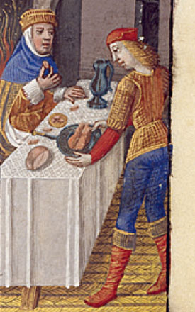 Ya Alfonso X da consejos a sus hijos sobre el comportamiento en la mesa y uno de los primeros incunables trata de modo alegórico el orden de los manjares y modo de servir en la mesa. El arte de trinchar tuvo un autor ilustre en el marqués de Villena.