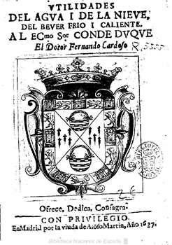 Cardoso, Isaac (1603 ó 4-1683). Vtilidades del agua i de la nieue, del beuer frio i caliente. - En Madrid : por la viuda de Al¯oso Martin, 1637. - [7], 108 h., [1] h. de grab. ; 8º