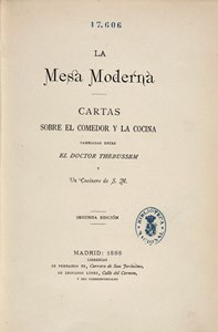Thebussem, Doctor (1828-1918). La mesa moderna : cartas sobre el comedor y la cocina cambiadas entre el Doctor Thebussem [seud.] y un cocinero de S.M. - Madrid : Librerías de Fernado Fe y de Leocadio López y sus corresponsales, 1888. - 316 p. ; 20 cm.