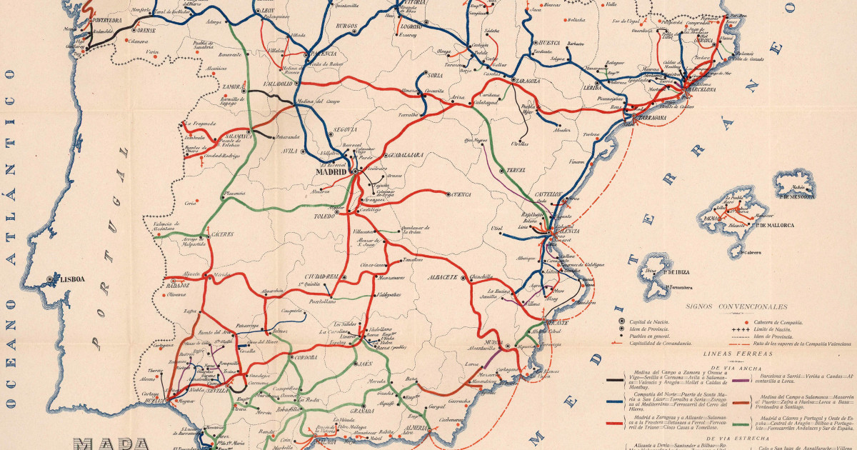 El mapa muestra la situación de la red ferroviaria de España en 1917. Siguiendo una estructura radial con centro en Madrid y complementándose con redes ferroviarias costeras.
