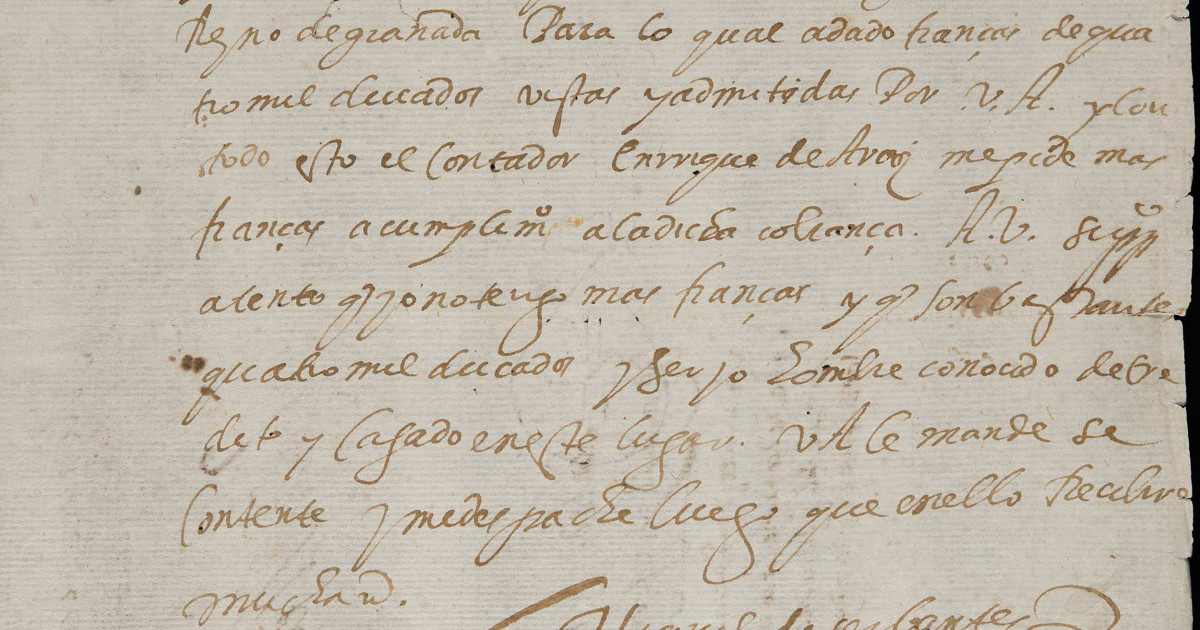 Carta autógrafa de Miguel de Cervantes al contador Enrique de Aray, sobre las dificultades y necesidades de fianzas.