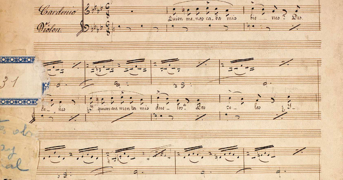 Manuscrito autógrafo de Francisco Asenjo Barbieri de la música que compuso para la zarzuela Don Quijote de La Mancha de Ventura de la Vega, estrenada en una función conmemorativa dedicada a Cervantes, en el Teatro del Príncipe el 23 de abril de 1861. La obra fue precedida de la obra La hija de Cervantes, escrita por Eugenio Hartzenbusch. Después de finalizar la obra de Ventura de la Vega y Barbieri “hubo un rompimiento de decoración, apareciendo en el fondo iluminada la estatua del gran genio, a cuyos pies fueron depositando coronas de laurel los actores que habían representado los distintos personajes de su gigantesca creación, entre los aplausos del público”, informaba el diario La Iberia del día siguiente. La celebración finalizó con la lectura de unas poesías de Villaseca y Ventura de la Vega y de unas octavas en honor a Cervantes.