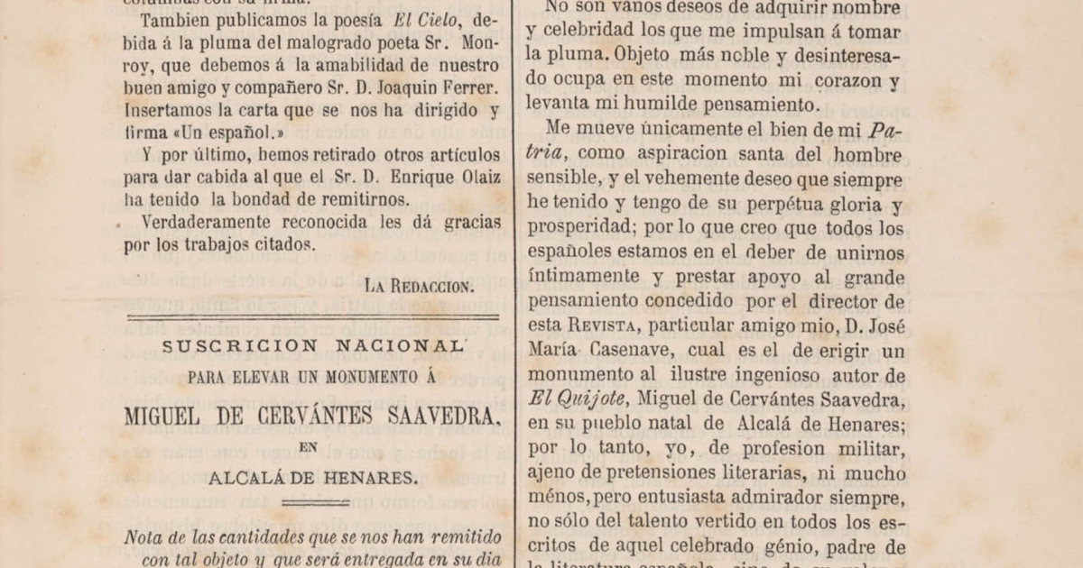Esta revista de periodicidad semanal fue fundada en 1875 con el propósito de recaudar fondos para sufragar un monumento a Cervantes en su ciudad natal, Alcalá de Henares, en el mismo lugar donde estaba la casa en la que nació ‘tan preclaro varón, gloria y honor de España’, según podemos leer en la misma publicación.