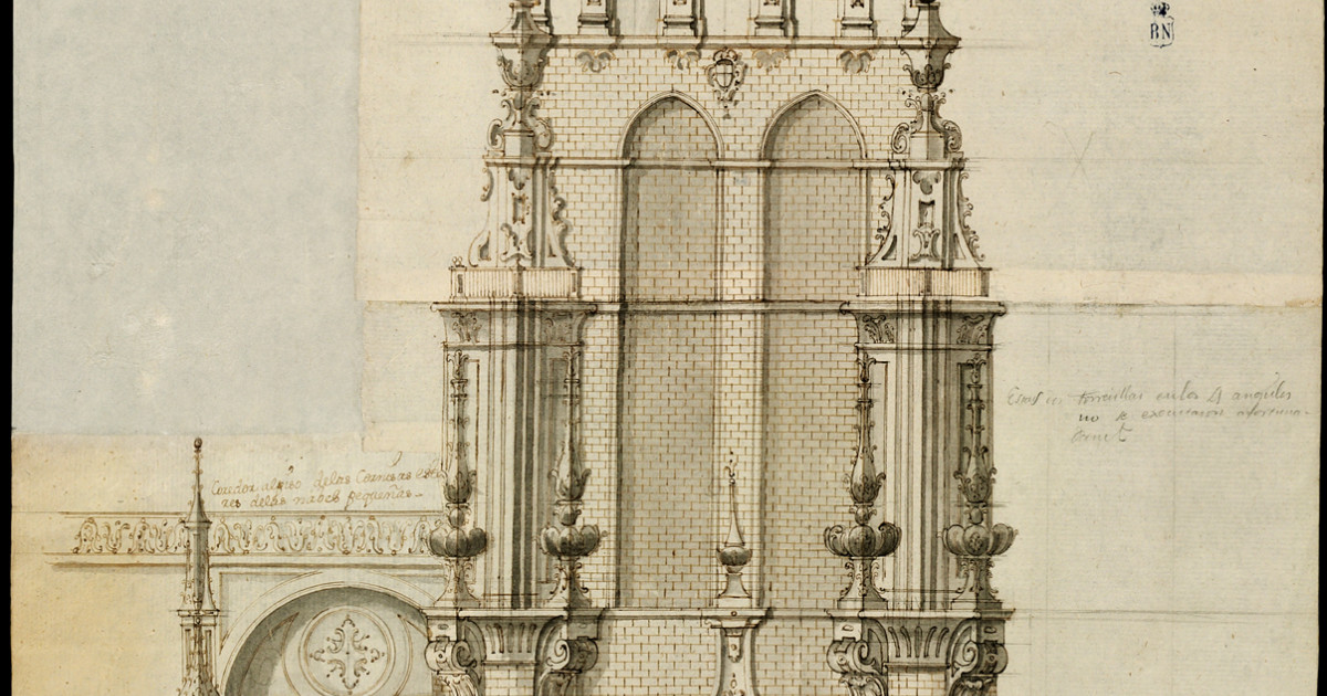 Entre los dibujos que se conservan en la BNE existe un magnífico conjunto de dibujos de arquitectura, dibujos que fueron realizados por algunos de los arquitectos españoles, italianos o franceses más importantes, integrados en distintas corrientes arquitectónicas, entre ellos José B. Churriguera, Juan de Villanueva, Ventura Rodríguez, Filippo Juvarra, los Bibiena, Sabatini y otros muchos, incluidos los dibujos anónimos, no menos importantes. Su procedencia es muy variada: Biblioteca Real, Fondo Carderera, Colección Izquierdo, Colección Castellano, Colección Madrazo, distintos legados, donaciones, etcétera. El dibujo es, por lo general, el nexo de unión entre lo que el arquitecto sueña y lo que realiza, pero también encontramos en esta colección cuadernos de viaje, apuntes académicos o trazados de arquitecturas efímeras.