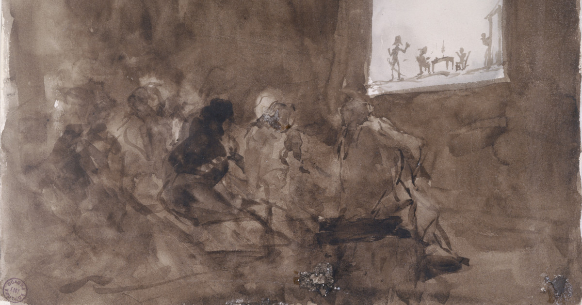 La linterna mágica, espectáculo visiual reservado a una minoría, consistía en proyectar, por medio de lentes, las formas pintadas en tiras de vidrio, inmensamente iluminadas, de manera amplificada; es el antecedente del cinematógrafo, un nuevo arte plasmado a través de una imagen pictórica: dos siluetas proyectadas de perfil están sentadas alrededor de una mesa con candil; a su lado, una tercera de frente con sable y sombrero.