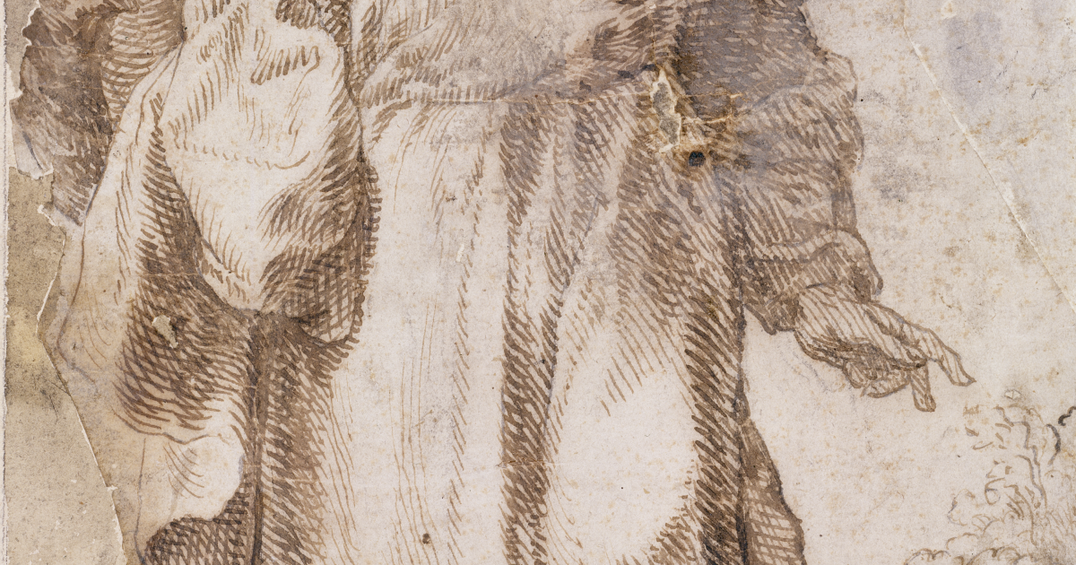 En este dibujo sobre papel verjurado amarillento, pegado a un segundo soporte, encontramos ese plumeado característico del artista, realizado con pluma de caña muy fina, tinta y aguada marrones. Está firmado y fechado a pluma con la misma tinta del dibujo en el borde inferior derecho. Esta obra, procedente de la colección Madrazo, pertenece a un Apostolado hoy disperso.