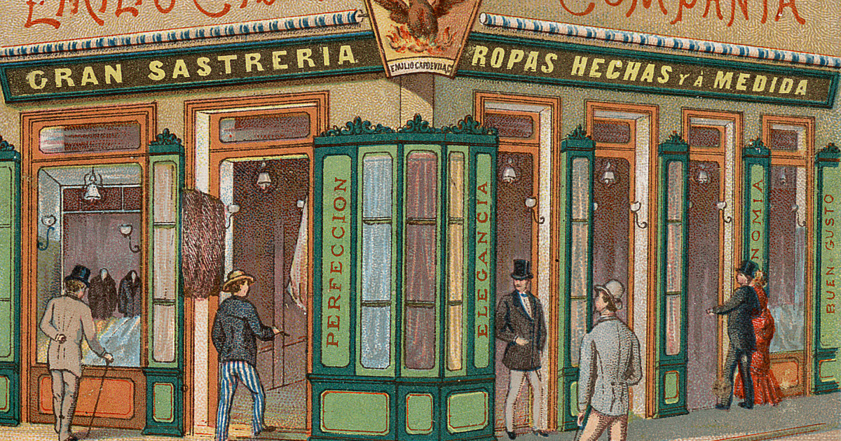Los comerciantes y fabricantes de los más variados productos ilustran sus tarjetas comerciales con escenas de parejas o varias figuras como reclamo publicitario. Destaca el número de tarjetas comerciales dedicadas a la venta de productos textiles, ropa, zapatos y complementos. Los almacenes y sastrerías de "Emilio Capdevila y Compañía", "Balta y Cª", "Pablo Despax", "Pedro Formen y Puig" y el bazar "Al león español" o las zapaterías de" Serra Hermanos", "Sellés y Nadal" o "La Criolla", ilustran su publicidad con varias personas a la entrada de sus comercios o bien se muestra el interior repleto de clientes y probándose el género como en el caso de las zapaterías. Hay otros casos en los que se muestran escenas de parejas en actitudes galantes y amorosas como son la camisería de "Elías y Bartralot", la sastrería de "José Morlaycot" y los comercios "El Indicio" y "Cabot, Canals y Robellat". Las tarjetas con publicidad de productos de alimentación, especialmente el chocolate, utilizan temas más divertidos en sus ilustraciones; así la marca "Arumí de Vich" presenta la imagen de un mozalbete pintando el cuerpo de un niño nativo africano, o la marca "Amatller" que presenta la imagen de unos niños caminando tras un hombre-anuncio con la marca en su espalda, mientras que en la tarjeta del chocolate "Juncosa" se ve una barbería donde un barbero afeita a un cliente, ambos de aspecto infantil. Las siete tarjetas con publicidad de la marca "Amidon Remy" reproducen otras tantas escenas donde se ve el reparto de grandes cajas del producto por diversas partes del mundo y en todo tipo de transportes: desde la India donde las cajas van sobre grandes elefantes, hasta Groenlandia donde el transporte se hace en trineos arrastrados por renos. Hay también tarjetas de otro tipo de comercios: farmacias, depósitos de pianos e, incluso, el establecimiento de un óptico francés.