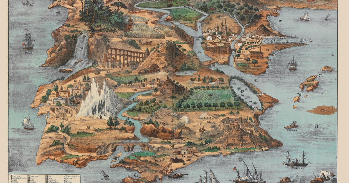 En este mapa de geografía física se explican los principales fenómenos de la naturaleza, los espacios urbanos y arquitectónicos, de una forma visual, sobre un mapa imaginario, en el que se reconoce el perfil de la Península ibérica. Un mapa que nos enseña a reconocer la geografía física de nuestro país.