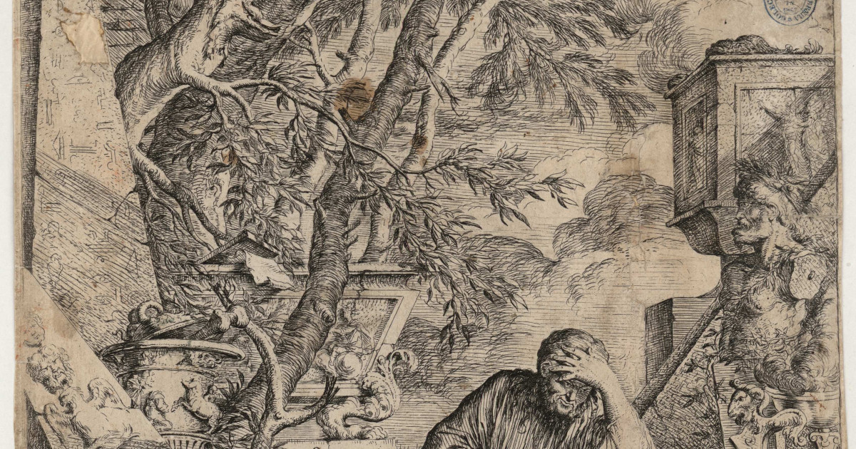 Salvatore Rosa destacó dentro del panorama del grabado napolitano del s.XVII. Nació en Nápoles en 1615 y falleció en Roma en 1673. Fue un artista muy peculiar y polifacético. Se hizo muy popular por sus aguafuertes de diferentes temáticas: escenas de batallas y de soldados, grabados de género, paisajes, retratos, alegorías, etc. Esta estampa refleja el momento en el que al filósofo Demócrito se le congela la risa al pensar en el final de todas las cosas. Se ha pensado que Goya pudo inspirarse en este grabado para su estampa El sueño de la razón produce monstruos, de la serie Los Caprichos.