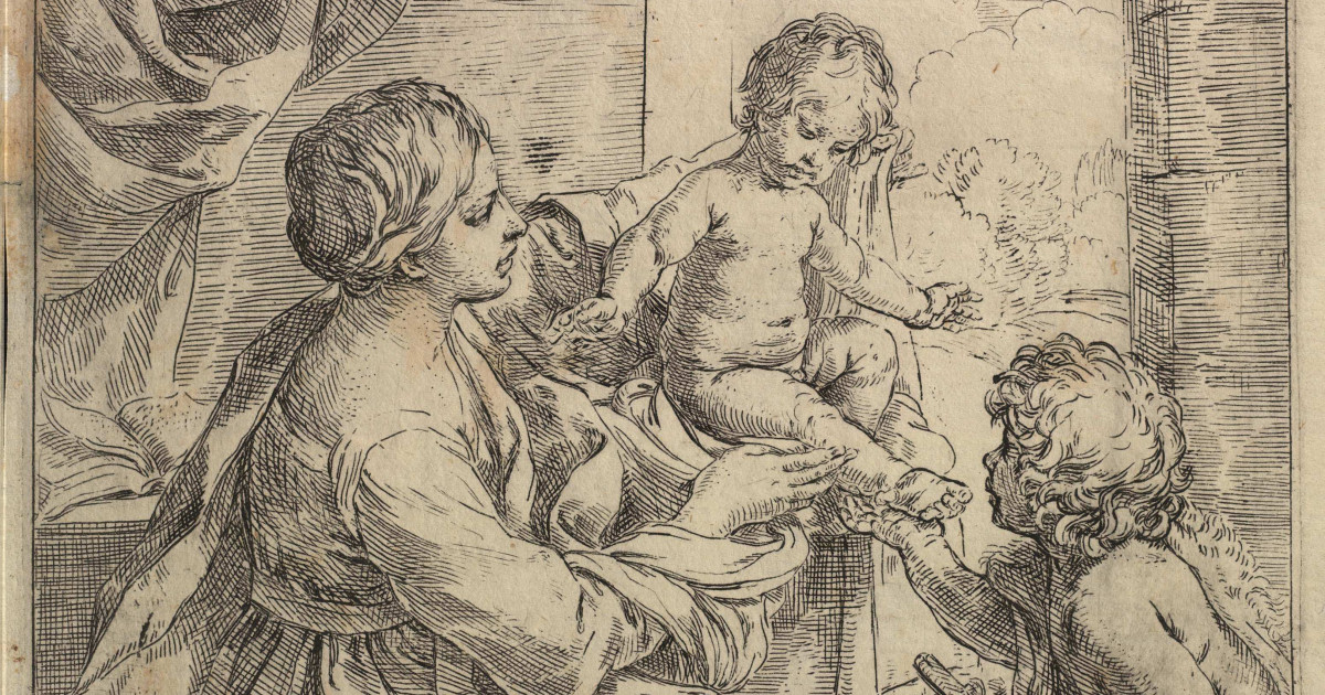 El asunto que trata la imagen es muy característico de las estampas religiosas de los siglos XVI y XVII. Aquí San Juanito se dispone a besar el pie del Niño Jesús, acompañado por la Virgen María. Guido Reni (1575 -1642) fue uno de los pintores más destacados del Barroco italiano. Activo en Bolonia y también en Roma, Reni alcanzó una gran fama gracias a sus pinturas y grabados, no solo en Italia sino también en otros países europeos como Francia y España. Grabó alrededor de cuarenta aguafuertes enorme calidad con un estilo muy libre y personal. La BNE conserva también una copia invertida de esta estampa publicada por A. Bonenfant.