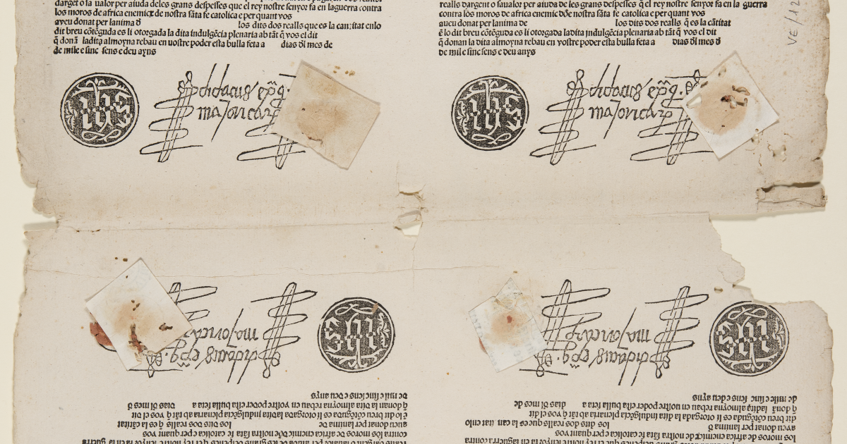 Las bulas de indulgencia son documentos donde el Papa concede algún tipo de indulgencia, de ahí su nombre, a cambio de una cantidad que se recaudaba con distintas finalidades, desde costear la construcción de catedrales hasta sufragar los gastos de las cruzadas. Según quién la recibiera podían ser de dos tipos: de vivos o de difuntos. Este pliego contiene 8 ejemplares de una bula de difuntos otorgada por Julio II para costear “la guerra contra los moros de Africa”. Estas bulas no se llegaron a utilizar, lo que constituye un ejemplo muy interesante de cómo se imprimían estos pequeños textos. El siguiente paso sería cortar el pliego y, una vez adquiridas, rellenar el nombre del difunto cuya alma se quería salvar del purgatorio. Aunque carece de pie de imprenta, como es habitual en este tipo de impresos, se atribuye a las prensas de Arnao Guillén de Brocar en Logroño.