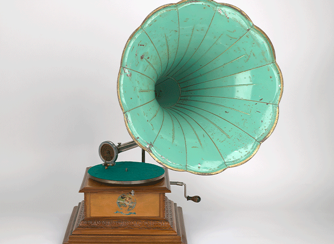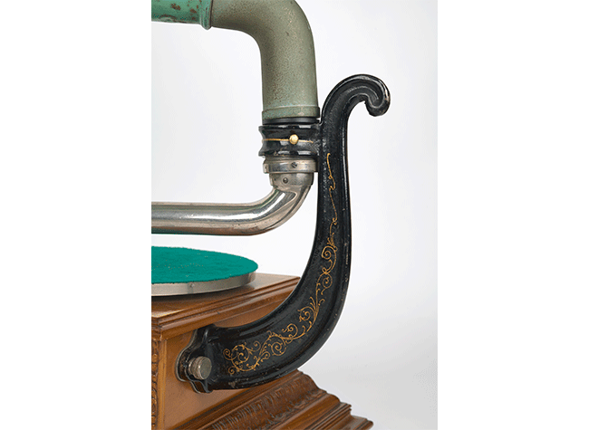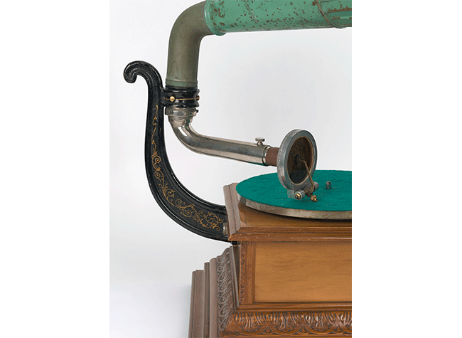 La caja de madera presenta forma rectangular, de base escalonada y en el arranque del cuerpo central detalles tallados de ondas. En las esquinas laterales también se aplican otros detalles decorativos. La parte superior de la caja contiene el plato giratorio o soporte del disco para la grabación y reproducción del sonido, brazo acústico no articulado unido al grabador - reproductor y el extremo opuesto se comunica con la bocina interior. El brazo que conecta la trompa y el reproductor es de metal cromado fijado a la caja mediante un bello codo de forma sinuosa, también de metal. El diafragma de la cabeza lectora está asegurado al frente mediante una estructura atornillada. La bocina es de gran tamaño.