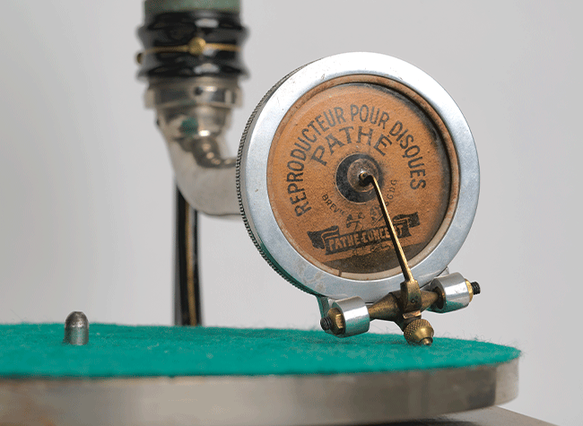 Singularidad técnica de los gramófonos Pathé de esta época es su sistema de reproducción de discos de corte vertical, frente a los cortes laterales usados por otros fabricantes contemporáneos. Para ello se necesitaba la aguja con punta de zafiro, Los discos giraban a 80 rpm y se reproducían desde el centro hacia el borde. El regulador de velocidad del aparato está graduado de 80 a 105 rpm, y se controla mediante una flecha móvil sobre un sector marcado.