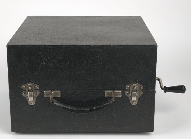 De tipo portátil con maletín de forma cuadrangular. Tapa de bisagra, con argollas cuadrangulares que la sujetan al quedar abierto el aparato. Dos cierres metálicos y remaches también de metal en el asa. La parte interior de la tapa presenta forma cóncava que actúa como caja de resonancia. Pabellón de metal en forma de trompa de pequeñas proporciones, unido al brazo acústico y salida orientada hacia la parte interna de la tapa. En el lado derecho se dispone de una pequeña palanca que regula la velocidad. También cuenta con una cavidad con tapa para guardar las agujas, en el interior.