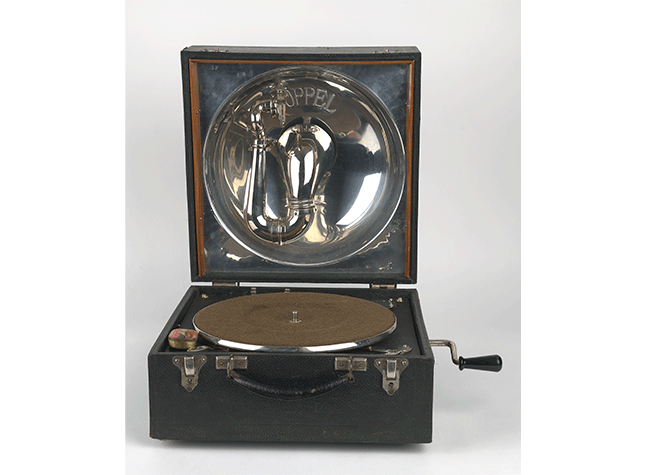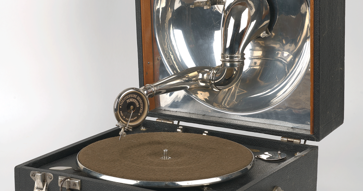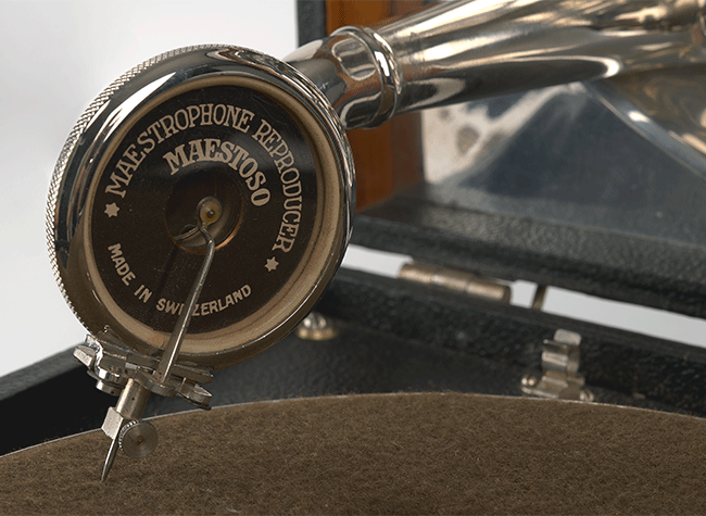 Este tipo de gramófono de "maleta" originalmente fue fabricado por Barnett Samuel & Sons Ltd., de Londres, en 1914, cuya principal característica resultaba de tener el altavoz resonador integrado en la tapa del aparato. La señal que salía del brazo reproductor se reflejaba en la tapa con forma semiesférica. De manera más popular se les denominó gramófonos de "trinchera", al ser habitual su uso por los destacamentos que iban al frente. Los componentes de esta pieza son de origen suizo como el reproductor acústico "Maestrophone Maestoso", fabricado por la casa Paillard. También es probable que el motor tenga la misma procedencia. Fue una práctica habitual que determinadas fábricas suministraran piezas y otros componentes y otras marcas realizaran el montaje y la comercialización de los aparatos.