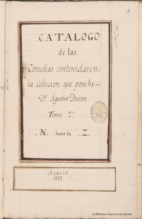 Tal vez a los habituales de la Biblioteca Nacional, o a los propios bibliotecarios que trabajan en ella, esta faceta de recolector de nuestra poesía popular no les resulte tan familiar como la de estudioso y coleccionista del teatro clásico español, asociada a la figura de Agustín Durán y manifiesta en la importantísima colección de comedias (entre otras obras) que se custodia en nuestros depósitos y que fue comprada por el Gobierno a su viuda tal día como hoy, un 27 de junio de 1863, por diez mil reales. La adquisición enfrentó a la Biblioteca Nacional con la Real Academia de la Lengua, de la que Durán era miembro.