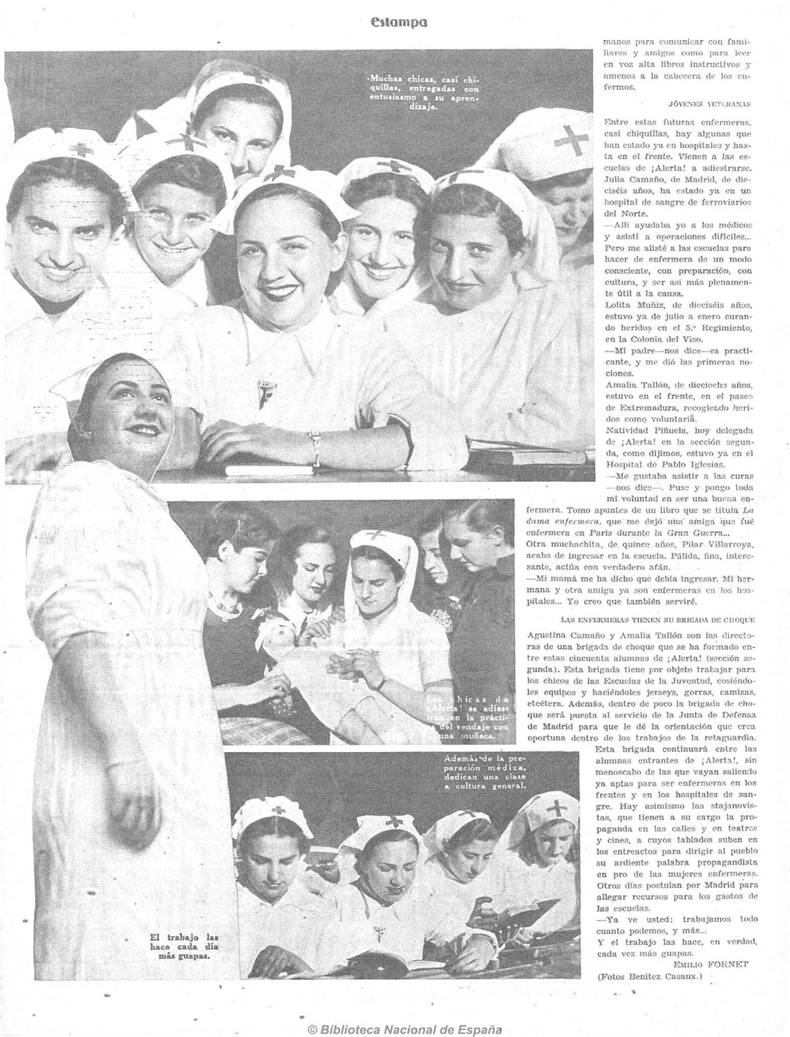 Comenzada la Guerra Civil, cada bando contará con su ejército de entregadas enfermeras. En el lado republicano la revista Estampa (1/5/1937) hizo un reportaje de las chicas madrileñas de 14 a 20 años que se alistaban para aprender el oficio de enfermera. De su entusiasmo y dedicación da prueba esta bellísima fotografía en la que se las ve felices, luciendo una sonrisa angelical, fotografía de la que nadie adivinaría que está hecha en plena guerra: