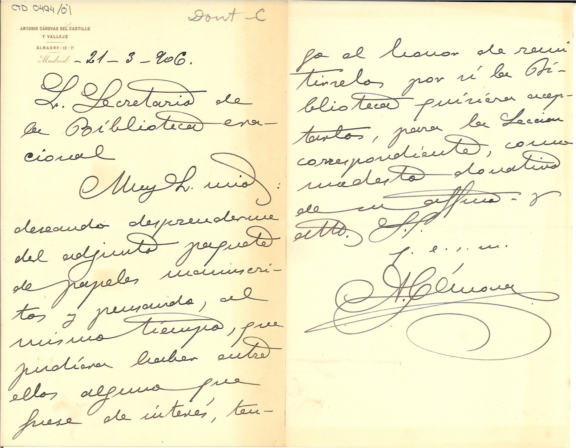 El segundo ofrecimiento viene en una carta fechada el 22 de octubre de 1909, autógrafa de Antonio Cánovas del Castillo Vallejo (con membrete impreso de su célebre galería fotográfica sita en el arranque de la calle de Alcalá), dirigida al director de la Biblioteca Nacional, que por entonces era el célebre bibliófilo Marcelino Menéndez Pelayo, a quien, por cierto, retrató en 1906[22]. Este documento es más explícito en cuanto a lo que ofrece y su procedencia: “tengo el honor de remitir a V. adjunto, como donativo para la Biblioteca que tan dignamente dirige, un paquete de manuscritos, conteniendo autógrafos de los generales Lafayette y Espoz y Mina, y Príncipe de la Paz, con anotaciones de D. Antonio Cánovas del Castillo”[23].