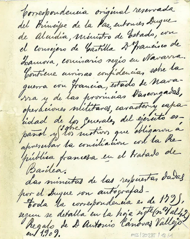 Otro bloque de documentos históricos mencionado en la carta de 1909, relacionados con Manuel Godoy, por entonces duque de Alcudia, es identificable con el actual manuscrito de la Biblioteca Nacional de España con signatura MSS/20285/12. Una antigua carpetilla corrobora esta procedencia. Compone este bloque la correspondencia de Godoy con Francisco de Zamora, comisario regio en el reino de Navarra, en un momento histórico determinante: 1795, durante las hostilidades de la Guerra de la Convención con la ocupación francesa de una parte del territorio vasco-navarro. Cuarenta y dos documentos entre originales y copias permiten seguir las conversaciones confidenciales entre el privado del rey y su representante. Salen a relucir temas tan delicados como el ardor bélico de los naturales, las diferentes opciones bélicas, el suministro de la tropa o la inestable situación política de las Vascongadas y Navarra[25].