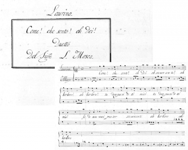 Un ejemplo de partitura copiada por Antonio Lázaro es el duetto del compositor napolitano Luigi Mosca “Come, che sento”: