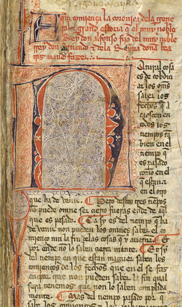 El manuscrito C, además, tiene la particularidad de que copia al principio el prólogo de la General estoria, el gran compendio historiográfico universal del rey Sabio, seguido ya después del prólogo de la Estoria de España propiamente dicho: “Aqui comjença la coronjca dela general e grand estoria que el muy noble Rey don alfonso fijo del muy noble rrey don fernando e dela Reyna donna beatriz mando fazer” (rúbrica en rojo, en la imagen).