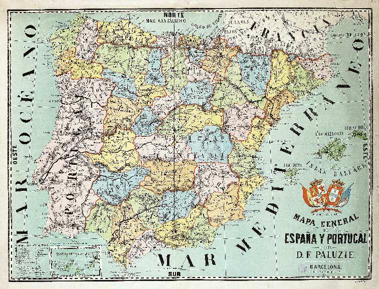 3.. Paluzíe, Faustino (1833-1901). Mapa General de España y Portugal, 1877, [BNE, MR/18 España. Mapas políticos. 1877] http://bdh-rd.bne.es/viewer.vm?id=0000035632En el siglo XIX aparecieron grandes figuras en la creación y edición de materiales didácticos y divulgativos. En España destacan los Paluzíe. El apellido Paluzíe corresponde a una saga familiar de editores que se inició con Esteban Paluzíe y Cantalozella a mediados del siglo XIX, y siguió con su hijo Faustino Paluzíe. Su producción se centró principalmente en libros educativos, atlas y mapas escolares, desempeñando una importante labor pedagógica en la difusión del conocimiento cartográfico y geográfico en la España del siglo XIX y del siglo XX, sobre todo en una época en la cual la escasez de material educativo para escolares era una constante. En el fondo de la BNE existe una amplia colección de mapas escolares de Paluzie, de grandes dimensiones para su utilización en las escuelas, además de atlas, manuales de geografía y también obras relacionadas con otras materias, como la gramática y la lengua.