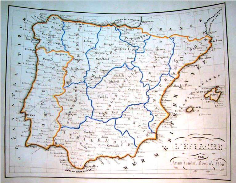 6. Vanden Broeck, Anna. L`Espagne, 1850 [BNE, MR/9/22] En la Biblioteca Nacional conservamos un dibujo de un mapa manuscrito coloreado de la península ibérica firmado por Anna Vandem Broeck. No se sabe nada más sobre la autora pero parece ser que este mapa se utilizaría más tarde como patrón para bordarlo en un bastidor (una sugerencia de Tony Campbell, ex Jefe del Servicio de Cartografía de British Library). El mapa carece de escala, graduación y es muy sencillo. La finalidad de este mapa no sería por tanto su estudio ni su uso cartográfico, sino el desarrollo de las “habilidades estéticas” de las que hemos hablado antes, cuyo objetivo final sería la confección de un objeto ornamental.