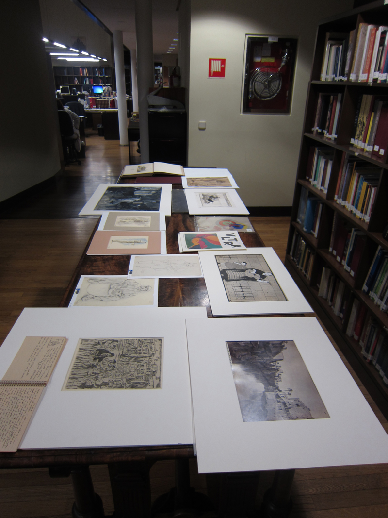 IMG_3002En cuanto a la presencia de las vanguardias artísticas en las colecciones del Servicio de Dibujos y Grabados utilizamos a la Familia Ferrant para ver el cambio de estilos e influencias a lo largo de más de un siglo y medio. De Luis Ferrant (1806-1868) elegimos Colección de 12 suertes de toros. 12 litografías coloreadas, obra que nos permite mostrar algo de Goya. Siempre es fascinante ver algo de su obra, en este caso una prueba de estado de uno de los grabados de la Tauromaquia, Valor varonil en la célebre Pajuelera en la de Zaragoza . De su sobrino, Alejandro Ferrant Fischermans (1843-1917), brillante pintor e ilustrador, un tanto olvidado, conservamos varios dibujos y litografías, y el elegido para esta visita es Contrastes de la vida guasch utilizado en el número aparecido el 8 de enero de 1897 de La Ilustración Española y Americana. Y estas dos obras nos sirven para saltar a la vanguardia de los años 20, ya que el hijo de Alejandro Ferrant, Ángel Ferrant (1891-1961) (dos dibujos sin título), cuyo ámbito de creación fue fundamentalmente la escultura, fue uno de los 48 artistas que expuso en la Exposición de Artistas Ibéricos de 1925, celebrada en Madrid, junto con Benjamín Palencia (1894-1980) (Muchacho campesino con los brazos cruzados y Muchacho campesino) o Francisco Bores (1898-1972) (Xilografías : colección de veinte grabados originales). En esta misma exposición participó igualmente un artista ya consagrado, José Gutiérrez Solana (1886-1945) del que mostramos el aguafuerte El ciego de los romances : El cartel del crimen y un fácsímil, Cuadernos de París.