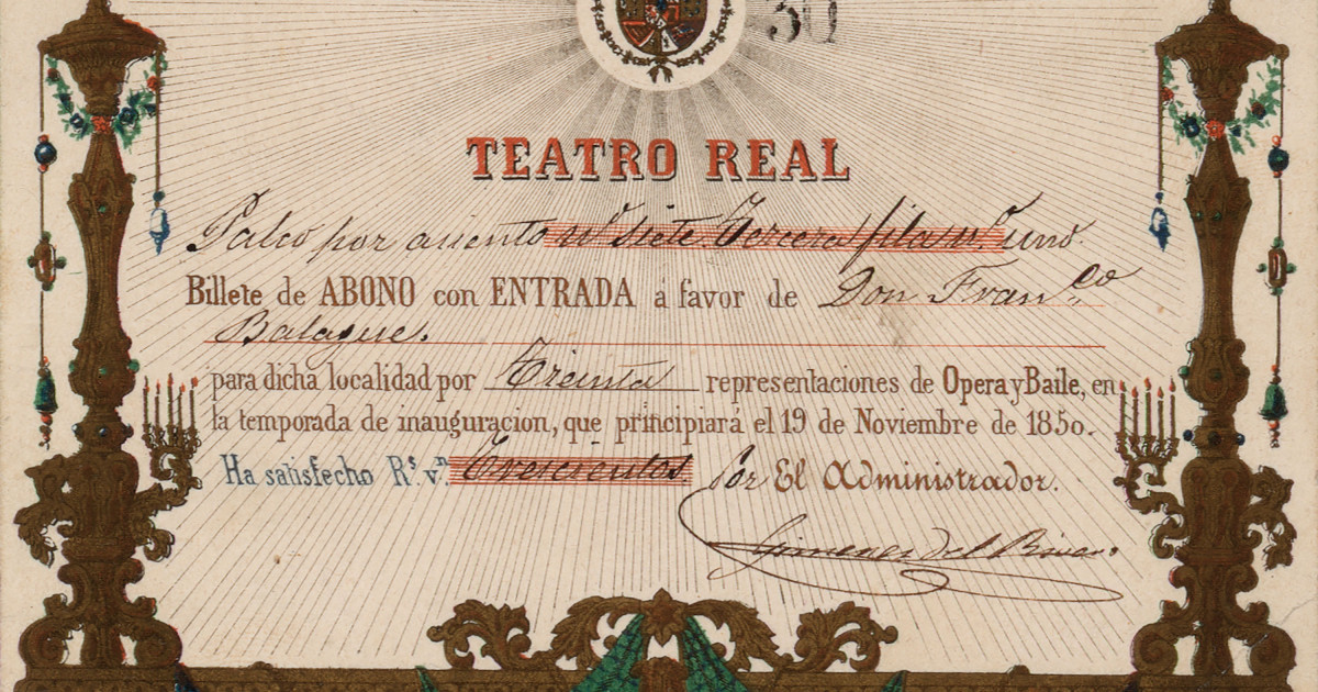 El billete para el Teatro Real está ilustrado con el escudo real y una decoración ornamental que enmarca el texto.