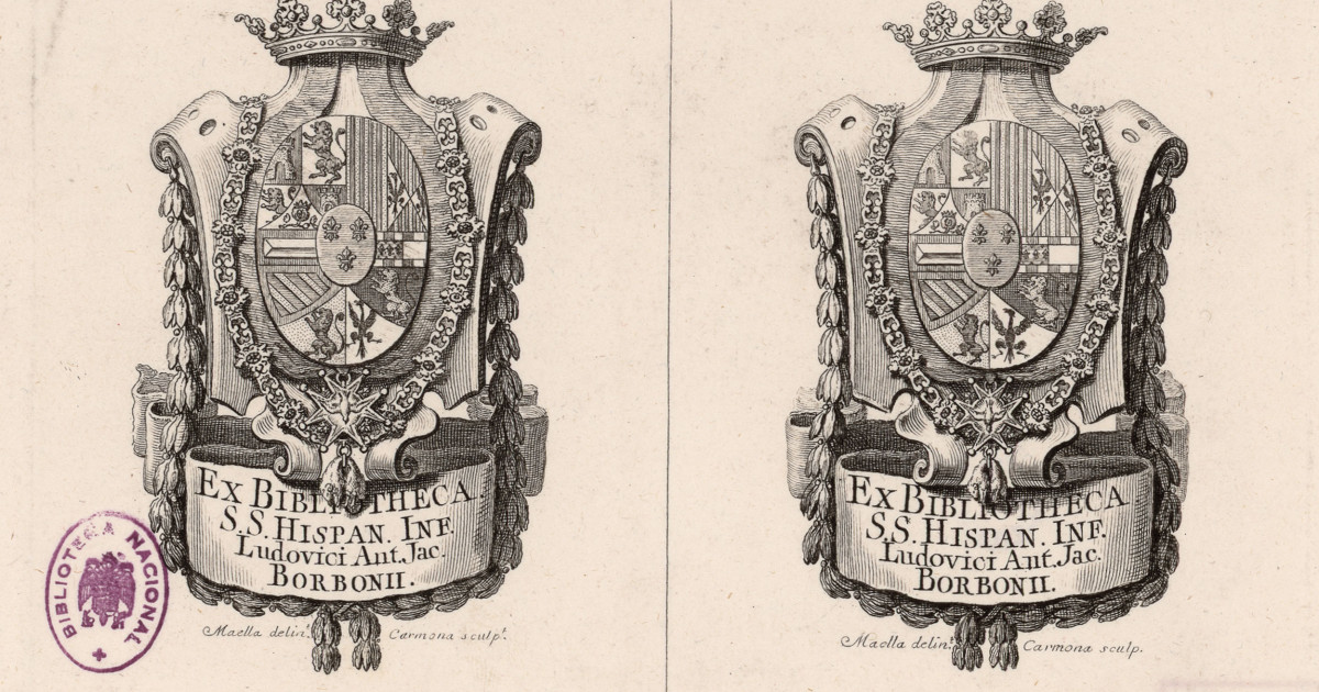 El ex libris del Infante Don Luis de Borbón fue realizado por el grabador del rey Manuel Salvador Carmona (1734-1820), conocido, entre otros muchos trabajos, por sus grabados en el Parnaso español y en el Quijote de Ibarra. Son dos ex libris iguales en la misma plancha que contienen la inscripción: "Ex bibliotheca S. S. Hispan. Inf. Ludovici Ant. Jac. Borboni"