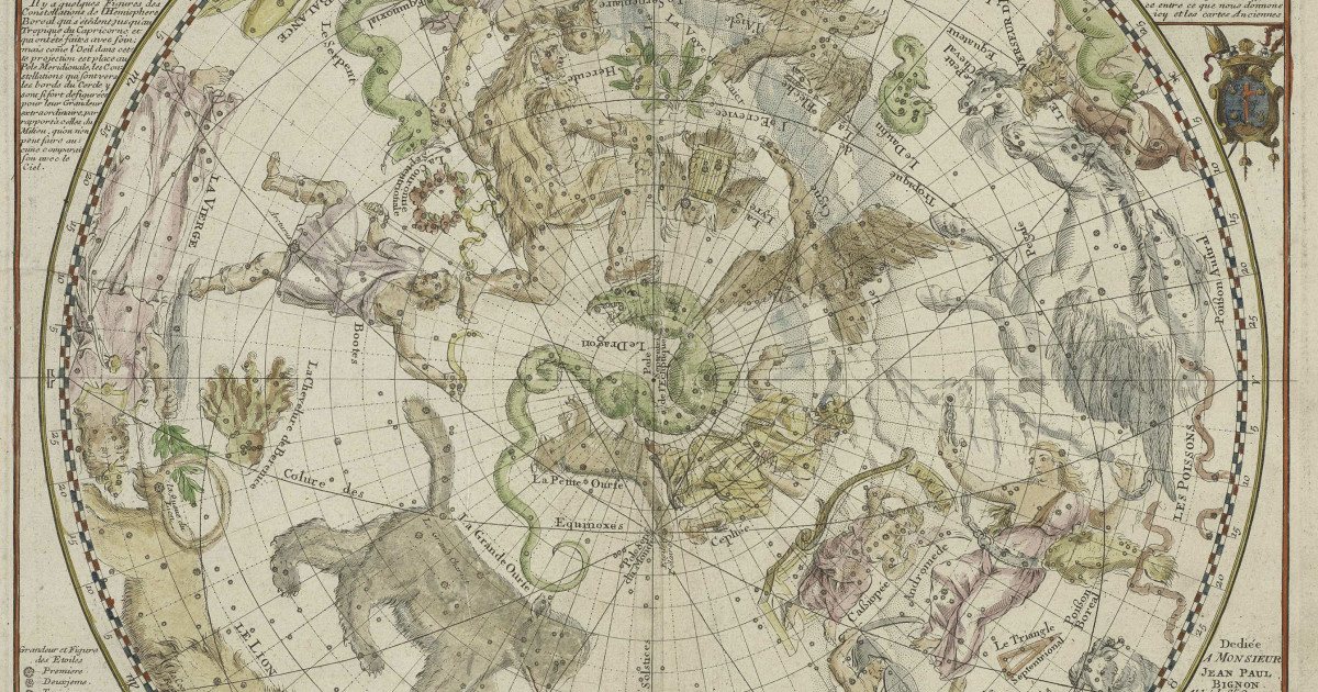 Planisferio celeste presentado en el hemisferios septentrional. La proyección, centrada en el polo eclíptico y que tiene como circunferencia el círculo zodiacal de la eclíptica, es cóncava, apareciendo las constelaciones como se ven en el cielo real. La forma utilizada para trazar las constelaciones está inspirada en el atlas Uranometría de Bayer.